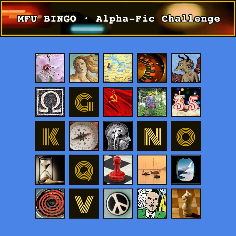 An MFU fic bingo board with the letters A, B, C, D, E, F, H, I, J, L, M, P, R, S, T, U, W, X, and Z filled in.
