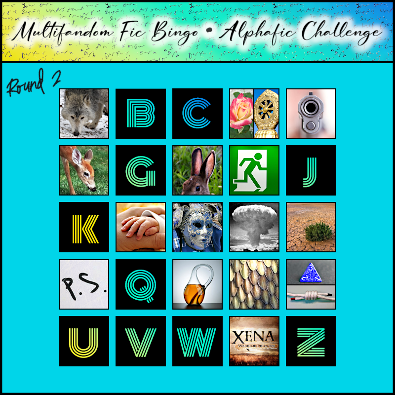 A multifandom fic bingo card with the letters A, D, E, F, H, I, L, M, N, O, P, R, S, T, and X filled in.