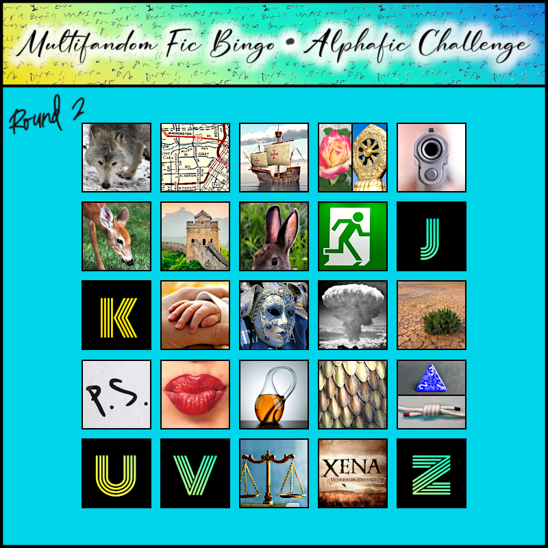 A multifandom fic bingo card with all letters except J, K, U, V, and Z filled in.